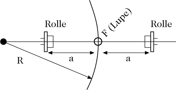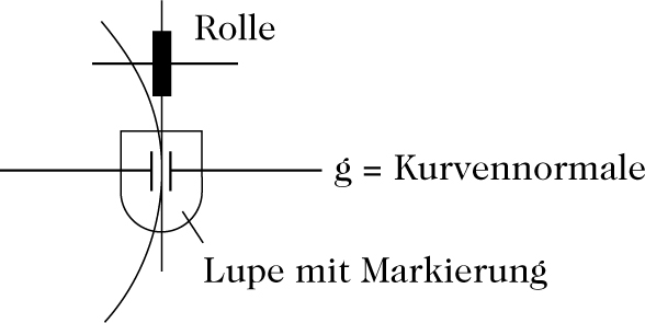Beim Zweirollengerät (Abb. 1) müssen die Auflagepunkte der beiden Rollen, deren Achsen in Richtung eines Lineals fallen, das mit der Kurvennormalen übereinstimmt, den gleichen Abstand vom Führungspunkt haben. Die Ausrichtung auf die Kurvennormale erfolgt mittels Lupe.