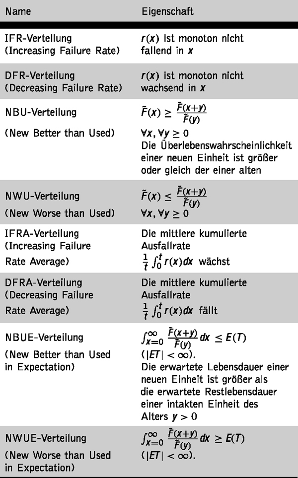 In der Zuverlässigkeitstheorie werden die Lebensdauerverteilungen entsprechend der Eigenschaften ihrer Ausfallraten und Überlebenswahrscheinlichkeiten in folgende Klassen eingeteilt: