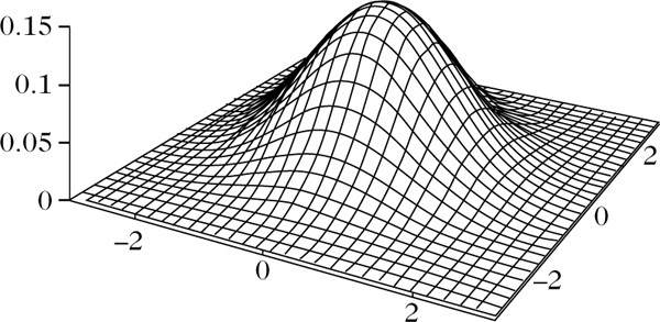gegeben, wobei ϱ = ϱ(X1, X2) den Korrelationskoeffizienten von X1 und X2 sowie μ = E(Xi) den Erwartungswert und \({\sigma }_{i}=\sqrt{Var({X}_{i})}\) die Standardabweichung von Xi, i = 1, 2, bezeichnet. Die Abbil-dung zeigt die Dichtefunktion der bivariaten Normalverteilung, für den Fall, daß es sich bei μ um den Nullvektor und bei Σ um die Einheitsmatrix handelt.