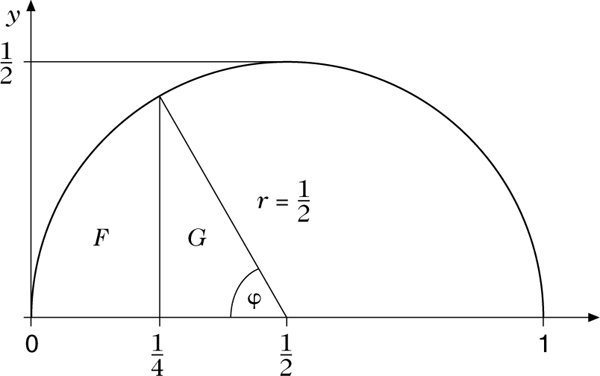 Newton betrachtete den Halbkreis mit Radius \(r=\displaystyle\frac{1}{2}\) und Mittelpunkt \(\left(\displaystyle\frac{1}{2},0\right)\), also \(y=\sqrt{x-{x}^{2}}\) (vgl. Abb.).