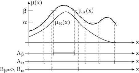Andererseits erhält man eine unscharfe Menge als obere Einhüllende ihrer Niveau-Mengen. In Anwendungen empfiehlt es sich daher, eine endliche Teilmenge L ⊂ [0, 1] relevanter Zugehörigkeitsgrade auszuwählen, für diese dann die zugehörigen Niveau-Mengen festzulegen und die unscharfe Menge à durch das Mengensystem