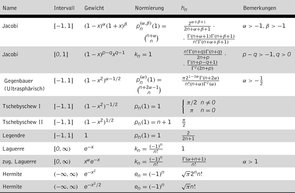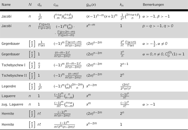 Für weitere Information über diese orthogonalen Polynome vergleiche man auch die jeweiligen Stichworteinträge. Weitere orthogonale Polynome findet man in Tabelle 1, explizite Entwicklungen in der Form
