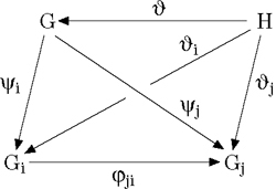 erfüllen. Eine Gruppe G mit Gruppenhomomorphismen {ψi : G → Gi}i∈J heißt projektiver Limes oder inverser Limes des Systems (Gi, φij), falls ψj = φji ○ ψi für alle i ≥ j gilt, und falls es für jede weitere Gruppe H mit Gruppenhomomorphismen ϑi : H → Gi, welche ebenfalls ϑj = φji ○ ϑi für alle i ≥ j erfüllen, genau einen Gruppenhomomorphismus ϑ : H → G gibt derart, daß ϑi = ψi ○ ϑ gilt (vgl. Abbildung).
