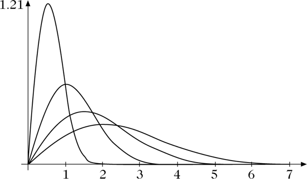 Dichten der Rayleigh-Verteilungen mit Parametern σ = 0.5(0.5)2.0