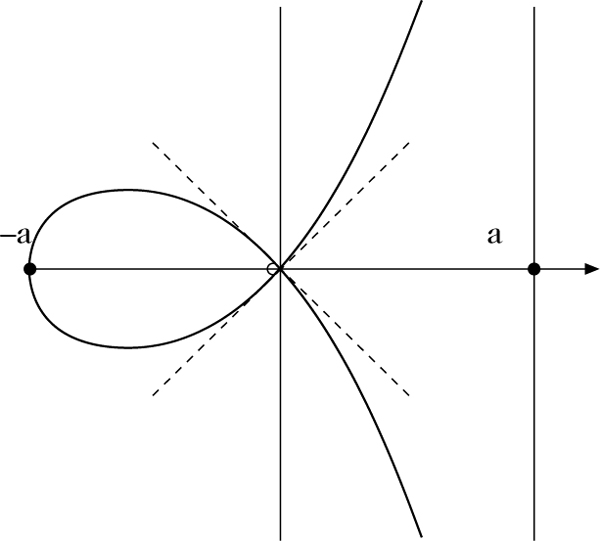 Die Strophoide hat die Asymptotenlinie x = a. Die Schleife in der linken Halbebene schließt die Fläche