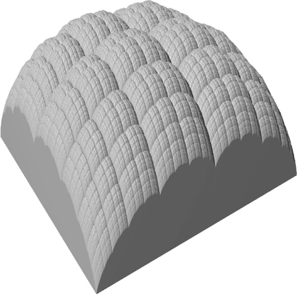 Auch solche Funktionen lassen sich durch Überlagerung entsprechender, auf ℝ2 definierter ℝ-wertiger Sägezahnfunktionen oder durch Mittelpunktverschiebung erhalten. Mittelpunktverschiebung um zufällige Verschiebungswerte w liefert je nach Verteilung der Zufallswerte unterschiedlich ‚rauhe‘ Funktionen, die sich zur rechnerischen Erzeugung von echt erscheinenden Bildern künstlicher Berglandschaften eignen.