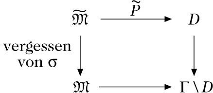 Dazu ist es zweckmäßig, die Periodenabbildung zu definieren: Es sei H ein festes Gitter mit einer (−1)k-symmetrischen Bilinearform Q : H ⊗ H → ℤ und \(D\subset \check{D}\) der Raum aller polarisierten Hodge-Strukturen vom Gewicht k desselben Typs wie die von \({H}^{k}\text{(}X\text{,}\ {\mathbb{Z}}\text{)}\ \text{(}X\in \ {\mathfrak{M}}\text{)}\) (Variation von Hodge-Strukturen). \(\tilde{{\mathfrak{M}}}\) sei die Menge aller Isomorphieklassen (X, σ), σ : Hk (X, ℤ) / Torsion \(\mathop{\to}\limits^{\sim}H\) (mit Q verträglich) und \({\rm{\Gamma}}\ \text{=}\ {\mathbb{O}}\text{(}H,\ Q\text{)}\). Jedes (X, σ) induziert dann eine Hodge-Struktur auf H, und man erhält Abbildungen: