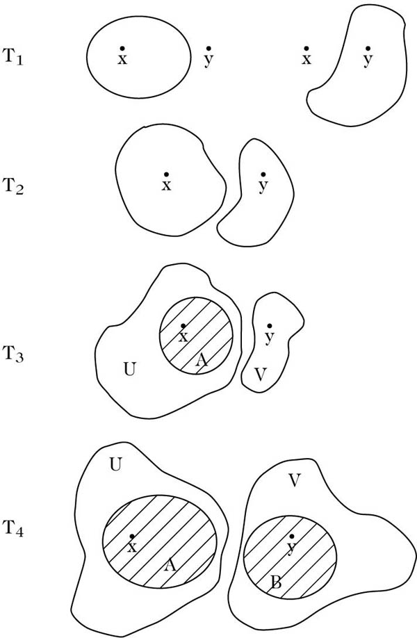 T1: Für alle x, y ∈ X mit x ≠ y gibt es eine Umgebung U von x mit y ∉ U und eine Umgebung V von y mit x ∉ V.
