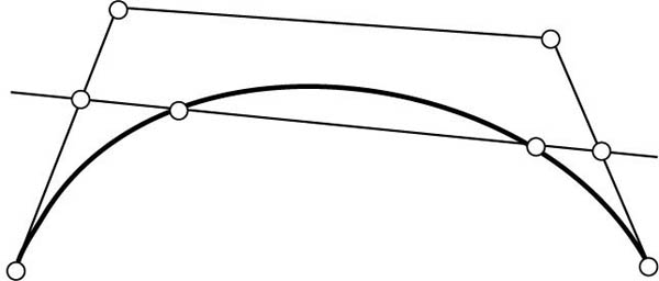Zum Beispiel schneidet eine Testgerade eine ebene Bézier-Kurve in höchstens so vielen Punkten wie ihr Bézier-Polygon (siehe Abbildung).