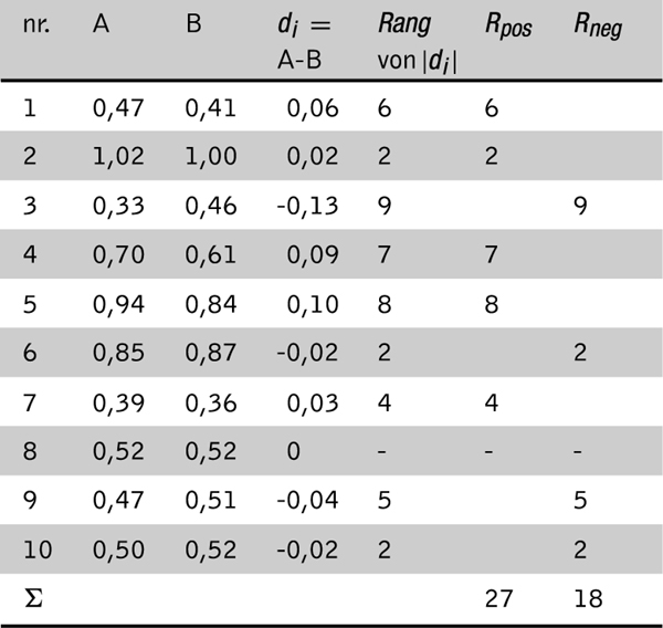 Damit erhält man T = min(Rmin, Rpos) = 18. Aus einer Tabelle entnehmen wir bei zweiseitiger Fragestellung und α = 0, 05 den kritischen Wert R(n = 9, α/2) = 5. Da T > 5 ist, kann H0 nicht abgelehnt werden.