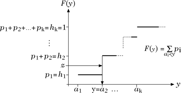 \begin{eqnarray}y={a}_{i},\,\text{falls}\,{h}_{i-1}\le z\lt {h}_{i},i=1,2,\ldots,k\end{eqnarray} wobei\begin{eqnarray}{h}_{0}=0\,\text{und}\,{h}_{i}={\sum }_{j=1}^{i}{p}_{j},i=1,\ldots,k\end{eqnarray} die kumulierten Wahrscheinlichkeiten sind (vgl. Abb. 1).