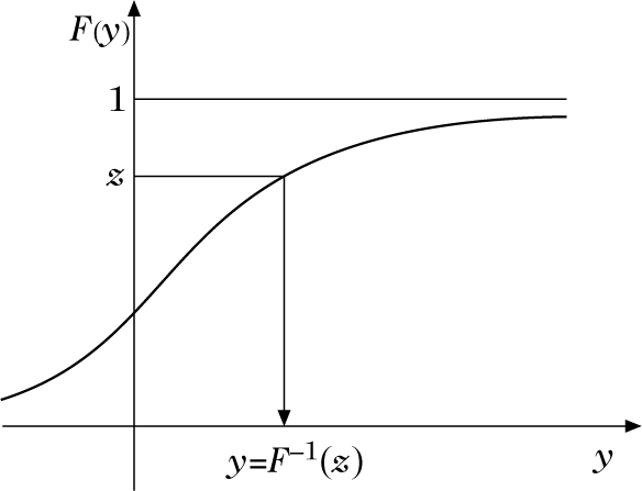 Stetige Verteilungen: Die gebräuchlichste Methode zur Erzeugung von Zufallszahlen y, die sich verhalten, als wären es Realisierungen einer Zufallsgröße Y mit der stetigen Verteilungsfunktion F, ist die sogenannte inverse Transformation. Sie ist die direkte Verallgemeinerung des Vorgehens im diskreten Fall (vgl. Abb. 2) und basiert auf folgendem Satz: