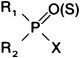 R1 (= Alkoxygruppe) und R2 (= Alkoxy-, Alkyl-, Dialkylamidogruppen) sind basische Gruppen, X (= Halogen-, Cyanid-, Phenoxy-, disubstituierte Pyrophosphatgruppen) sind saure (acide) Gruppen.