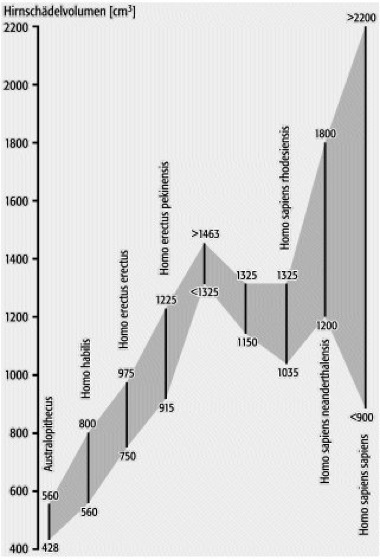 Anthropogenesew[von griech. anthropos = Mensch, genesis = Entstehung], Humanevolution,E anthropogenesis, der stammesgeschichtliche Vorgang der Entstehung, Diversifikation und teilweisen Auslöschung der menschenartigen Organismen (Gattungen Australopithecus und Homo). Im späten Miozän (vor ca. 5-6·106 Jahren) spalteten sich die Stammlinien der menschenartigen Organismen und der heutigen Menschenaffen auf. Die Australopithecinen durchliefen zunächst eine Phase der Diversifikation (5-7 Arten), starben jedoch im Pleistozän (vor ca. 1,5·106 Jahren) aus. Aus einer Australopithecinenart gingen vor ca. 2,3·106 Jahren die ersten Vertreter der Gattung Homo (Homo habilis) hervor. Ein mehr oder weniger kontinuierlicher evolutiver Prozeß führte vom Homo habilis über den Homo erectus zu den modernen Menschen, die vor ca. 300000 Jahren auftraten und die koexistierten (Homo sapiens sapiens, und Homo sapiens neanderthalensis, der "Neandertaler"). Nach dem Verschwinden der Neandertaler vor ca. 40000 Jahren ist Homo sapiens sapiens der einzige Vertreter der Gattung. – Folgende Merkmale, die im Lauf der Anthropogenese erworben wurden, unterscheiden die Menschen von den Menschenaffen: aufrechter Gang und zahlreiche damit verbundene Modifikationen des Bewegungsapparates (z.B. der Verlust des opponierbaren Großzehs); Verlust des Haarkleids; stetige Zunahme der Körpergröße; Verlust der Prognathie (Zurückweichen des Ober- und Unterkiefers) und die damit einhergehende Entstehung einer das Gesicht überragenden Nase und eines Kinns (die typisch menschliche Merkmale sind); Wanderung des Kehlkopfs in eine (relativ zu den Menschenaffen) tiefe Position am Hals, was die Erzeugung sehr differenzierter Sprachlaute (Sprache) erst ermöglichte. – Die Körpergröße der Hominiden nahm stetig zu, die aufgerichteten erwachsenen Australopithecinen waren nur etwa 1,20 m groß. Die durchschnittliche Größe des Gehirns (gemessen als Volumen der Höhlung des Hirnschädels, das sogenannte Endocranialvolumen, siehe Abb. ) nahm im Laufe der Anthropogenese von Australopithecinen (450 cm3) über die verschiedenen Unterarten des Homo habilis (650 cm3) und des Homo erectus (1000 cm3) zum Homo sapiens ständig zu, wobei Homo sapiens neanderthalensis das durchschnittlich größte (1450 cm3) Gehirn besaß. Die heute lebende Unterart des Menschen (Homo sapiens sapiens) zeichnet sich durch eine extreme Variationsbreite des Hirnvolumens aus, durchschnittlich liegen die Volumina bei 1250 cm3 (Frauen) bzw. 1350 cm3 (Männer). Da der Encephalisationsquotient, der die Größe des Gehirns relativ zum Körpergewicht ausdrückt, ebenfalls anstieg (von 3,0 bei den Australopithecinen bis zu 7,2 bei Homo sapiens sap. und neanderthal.), ist nur ein geringer Teil dieser Größenzunahme durch die Zunahme der Körpergröße zu erklären. Es muß also ein beträchtlicher selektiver Druck auf die Entstehung eines großen Gehirns hingewirkt haben. Die Natur dieses Drucks, vor allem zu Beginn der Größenzunahme bei den Australopithecinen (deren Encephalisationsquotient nicht höher als der der Menschenaffen ist), ist heftig umstritten. Wir wissen, daß bei uns heute lebenden Menschen die untere, "kritische" Grenze der Hirngröße bei etwa 950 cm3 liegt, Träger kleinerer Gehirne haben schwere kognitive Defekte. Ein "kognitiver Selektionsdruck" – zumindest an unseren Maßstäben der Kognition gemessen – scheidet deshalb als Selektionsfaktor bei der anfänglichen Größenzunahme des Gehirns aus. Sozial- und Sprachkompetenz sind als mögliche Selektionsfaktoren ins Feld geführt worden, ebenso ein "Redundanzargument" (Träger etwas größerer Gehirne sind beim teilweisen Ausfall einiger Hirnteile weniger betroffen als Träger kleinerer Hirne). Die Hirne der savannenbewohnenden Australopithecinen könnten tatsächlich unter großem Hitzestreß gestanden haben, so daß eine gewisse neuronale Redundanz von Vorteil gewesen sein mag – sie läßt Aktivität auch in großer Hitze zu. Unumstritten ist, daß die Entwicklung des aufrechten Gangs und die damit verbundene Nutzung der Hände (bei den Australopithecinen) dem Auftreten eines großen Gehirns zeitlich voranging. Die Tendenz zur Größenzunahme des Gehirns, die die Anthropogenese durchzieht, ist seit dem Auftreten des Homo sapiens zum Stillstand gekommen. Möglicherweise ist es die Enge des weiblichen Geburtskanals, die einer weiteren Vergrößerung des kindlichen Kopfes entgegensteht.