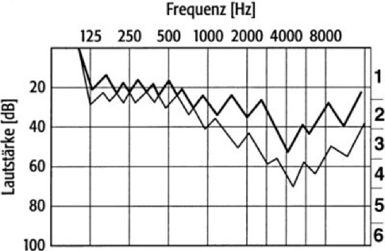 1 = normales Hören, 2 = geringe Hörbeeinträchtigung, 3 = mittlere Hörbeeinträchtigung, 4 = mittlere bis ernste Hörbeeinträchtigung, 5 = ernste Hörbeeinträchtigung, 6 = sehr starke Hörbeeinträchtigung