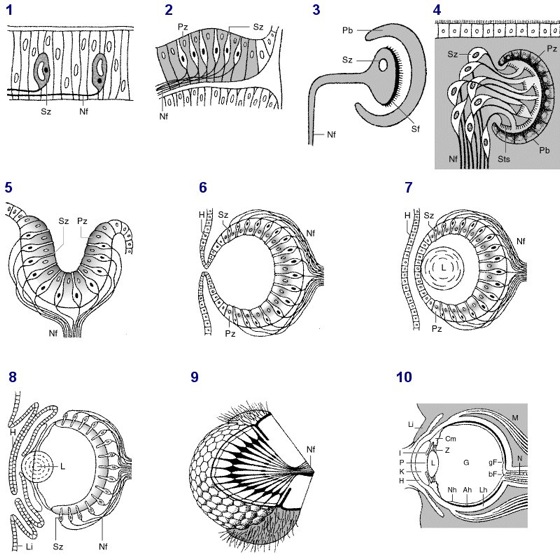 1 Lichtsinneszellen in der Haut des Regenwurms; 2Flachauge (Plattenauge) einer Qualle; 3 einfaches Becherauge (Pigmentbecherocellus, z.B. Lanzettfischchen); 4 zusammengesetztes Becherauge (z.B. Strudelwürmer); 5Grubenauge oder Napfauge einer Napfschnecke; 6 einfaches Lochkameraauge oder Lochauge bei Niederen Tintenfischen; 7Blasenauge einer Weinbergschnecke; 8Linsenauge bei Höheren Tintenfischen; 9Komplexauge (Facettenauge) bei Insekten und Krebstieren; 10Linsenauge des Menschen.