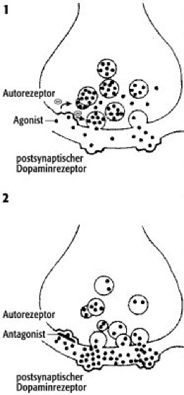 An den präsynaptischen Dopamin-Autorezeptoren bewirken Dopamin und andere Agonisten eine Hemmung der Dopaminfreisetzung (1), Antagonisten stimulieren die Freisetzung (2).