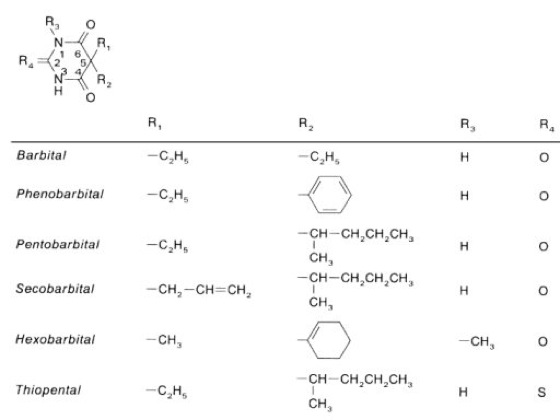 Barbiturate [Mehrzahl; von Barbitursäure], Diureide, E barbiturates, dosisabhängig sedierend, hypnotisch oder narkotisch wirkende Salze der Barbitursäure oder ihrer Derivate, die als Hypnotika, Sedativa, Narkotika und Antiepileptika Verwendung finden (siehe unten). Im Gegensatz zu den Benzodiazepinen haben die Barbiturate keine muskelrelaxierende Wirkung. Die verschiedenen Barbiturate bzw. Barbitursäurederivate ( siehe Abb. ) entstehen durch Substitution der Wasserstoffatome am C5 und an den Stickstoffatomen der Barbitursäure. Durch Kettenverlängerung des Substituenten am C5 wird die Wirkung der Barbiturate verstärkt. Eine weitere Wirkungsverbesserung kann durch Substitution an den Stickstoffatomen mit Methylgruppen oder Phenylgruppen oder durch das Ersetzen der C=O-Gruppierung am C2 durch C=S ("Thiobarbiturate") erreicht werden. Die Wirkdauer der Barbiturate ist ebenfalls abhängig von der Substitution. Barbiturate mit verzweigten, halogenierten und ungesättigten Seitenketten wirken nur kurz, Barbiturate mit unverzweigten, aromatischen und gesättigten Substituenten sind hingegen lange wirksam. Auch die Substituierung der Stickstoffatome verkürzt die Wirkdauer. Wasserlösliche Barbiturate verlassen den Körper renal fast unverändert, fettlösliche Barbiturate (z.B. Phenobarbital, Barbital) werden hingegen ins Fettgewebe eingelagert oder im endoplasmatischen Reticulum der Leberzellen metabolisiert. Durch Demethylierung oder Desulfurierung einiger Barbiturate entstehen Metabolite, die zum Teil noch hypnotisch wirksam sind. Oxidationsprodukte der Barbiturate sind in der Regel unwirksam und werden rasch renal eliminiert. Mit steigender Lipophilie der Barbiturate tritt die narkotische Wirkung schneller ein. Barbiturate werden als schwache organische Säuren schon im Magen resorbiert, da sie bei dem niedrigen pH des Magens in der nicht ionisierten und damit in der lipidlöslichen Form vorliegen. Im Blut werden die Barbiturate zum Teil frei und zum Teil an Albumin gekoppelt transportiert. Die nicht ionisierte Form der Barbiturate ist in der Lage, die Blut-Hirn-Schranke zu durchdringen. Barbiturate binden an den GABA-Rezeptor, wodurch der Cl-- Kanal bei Stimulation durch GABA länger offenbleibt. In welcher Hirnregion die Barbiturate bevorzugt binden, ist noch unklar und scheint dosisabhängig zu sein. Barbiturate sind auch Antagonisten an Adenosin-Rezeptoren (A1). Zusammengefaßt bewirken sie eine generelle Sedation des Zentralnervensystems. Sie verkürzen den REM-Schlaf sowie den Tiefschlaf, wohingegen das Stadium 2 des Nicht-REM-Schlafs verlängert wird. Nur zu Beginn der Therapie wirken die Barbiturate schlafinduzierend und schlafverlängernd. Bei längerer Anwendung geht dieser Effekt verloren. Dies beruht wahrscheinlich teilweise auf einer durch Enzyminduktion entwickelten Toleranz gegen die Barbiturate. Es werden aber auch adaptive Vorgänge im Zentralnervensystem (Beeinflussung der Transmitter-Rezeptor-Wechselwirkung; Neurotransmitter) diskutiert. Ein abruptes Absetzen der Barbiturate nach längerem Gebrauch hat einen REM-Rebound zur Folge, d.h., während des Schlafs werden vermehrt REM-Phasen durchlaufen, die oft mit Alpträumen verbunden sind. Aufgrund der Toleranzentwicklung, der Gefahr des Mißbrauchs (wegen der Entstehung psychischer und physischer Abhängigkeit; Sucht), starker Nebenwirkungen sowie bewußter (Suizid) oder unbewußter Intoxikation werden Barbiturate heute als Hypnotika nicht mehr verwendet (Ersatz durch Benzodiazepine). Dagegen haben Methohexital und Thiopental noch immer als Narkosemittel sowie Phenobarbital als Antiepileptikum eine große Bedeutung. Eine akute Barbituratvergiftung manifestiert sich durch Berauschtheit, Bewußtlosigkeit, Kreislaufschwäche, Kreislaufversagen, Atem- und Herzstillstand. Die Überlebenschancen bei einer solchen Intoxikation sind abhängig von der Dosis und der Art des verwendeten Barbiturats sowie von einer schnellen Diagnose. Meist werden neben einer Magenspülung Barbiturat-Antagonisten (zentral erregende Substanzen) sowie Pharmaka zur Beseitigung der Symptome bei der Behandlung der Barbituratvergiftung verwendet. Eine chronische Intoxikation mit Barbituraten besitzt eine Symptomatik, die der des Alkoholismus oder des Morphinismus (Morphin) ähnelt (Apathie, Antriebsschwäche, erhöhtes Schlafbedürfnis, Konzentrationsschwäche). Beim Absetzen der Barbiturate treten Entzugserscheinungen auf, die bis zu Epilepsie-artigen Anfällen (Epilepsie) führen können. – Verwendung von Barbituraten: 1) Barbiturate als Sedativa: Phenobarbital; 2) Barbiturate als Hypnotika: Barbital (Veronal®, lang wirksames Barbiturat, das vor allem bei Durchschlafstörungen verwendet wird), Phenobarbital (lange Wirkdauer), Allobarbital (mittellang wirksam), Cyclobarbital, Pentobarbital, Secobarbital (kurz wirksame Barbiturate, die vor allem bei Einschlafstörungen verwendet werden); 3) Barbiturate als Narkotika: zur Einleitung der Narkose oder zur Kurzzeitnarkose verwendete, rasch metabolisierbare Barbiturate, z.B. Hexobarbital, Thiopental, Methohexital; 4) Barbiturate als Antagonisten bei Vergiftungen mit Konvulsiv, wie z.B. DDT, Strychnin, Pentetrazol, Bemegrid: Phenobarbital, Methylphenobarbital; 5) Barbiturate als Antidot bei Überdosierung von Lokalanästhetika: Thiopental, Hexobarbital; 6) Barbiturate als Antiepileptika: Phenobarbital, Barbexaclon.
