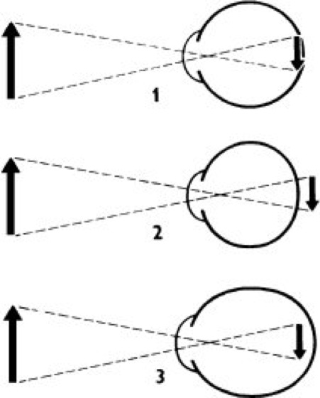 1 Normales Auge; Bild fällt auf die Netzhaut. 2 Weitsichtiges (zu kurzes) Auge; Bild fällt hinter die Netzhaut. Die Korrektur erfolgt durch eine Brille (bzw. Kontaktlinse) mit Konvexglas (Sammellinse), die das Gegenstandsbild wieder auf der Netzhaut erzeugt. 3 Kurzsichtiges (zu langes) Auge; Bild fällt vor die Netzhaut. Die Korrektur erfolgt durch eine Brille mit Konkavglas (Zerstreuungslinse), die das Gegenstandsbild wieder auf der Netzhaut erzeugt.