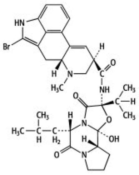 Bromocriptins, E bromocriptine, halbsynthetisches Mutterkornalkaloid-Derivat, das als Antiparkinsonmittel eingesetzt wird ( siehe Abb. ). Es handelt sich um einen Dopamin-Agonisten, der stimulierend auf die Dopaminrezeptoren im Gehirn wirkt. Als Antiparkinsonmittel kommt Bromocriptin vor allem dann zum Einsatz, wenn eine Therapie mit Levodopa (Dopa) nicht mehr den gewünschten Erfolg bringt. Da Bromocriptin eine sehr hohe Affinität zu Dopaminrezeptoren im Hypophysenvorderlappen (Adenohypophyse) besitzt, wird es auch zur Hemmung der Lactation nach der Geburt sowie beim Abstillen, bei Hypophysenadenomen und Prolactin-bedingten Hormonstörungen verwendet. Seine Wirkung beruht in diesem Fall auf einer durch Dopaminrezeptoren vermittelten Hemmung der Ausschüttung von Prolactin.