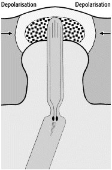 campaniformes Sensillum, Ecampaniform sensillum, epidermales Sinnesorgan bei Gliederfüßern (Arthropoden) zur Wahrnehmung mechanischer äußerer und innerer Reize (z.B. Muskelkräfte) und Beschleunigungen, die zu Verformungen der Körperwand führen (Mechanorezeptoren). Durch diese Kräfte wird indirekt eine Querkompression der Rezeptorspitze erreicht, die unter einer Cuticulakuppel in Matrix eingebettet liegt, was zu einer Depolarisation der Rezeptorzelle führt ( siehe Abb. ).