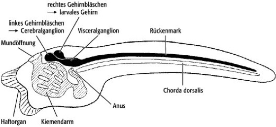 Manteltiere (Tunicata): Die Nervensysteme der meeresbewohnenden, als adulte Organismen meist festsitzenden Tunicaten (Seescheiden, Salpen) sind stark reduziert und bestehen lediglich aus einem über dem Schlund gelegenen Cerebralganglion (Oberschlundganglion) und den von ihm ausstrahlenden Nerven. Das Cerebralganglion steht mit der sogenannten Neuraldrüse in Verbindung, die als das Homologon der Hypophyse angesehen wird. Das Nervensystem der freilebenden Larven der Tunicaten ist besser differenziert ( siehe Abb. 1 ). Es besteht aus einem Rückenmark, das im muskulösen Schwanz der Larve über der Chorda dorsalis liegt. An seinem Vorderende weist es eine Anschwellung auf, die als Visceralganglion bezeichnet wird und vor der ein rechtes und ein linkes Hirnbläschen liegen. Das linke dieser Bläschen löst sich vom Rest des ZNS ab und bildet das Cerebralganglion des adulten Tieres. Das rechte Bläschen bildet das larvale Gehirn, es enthält Lichtsinnesorgane und eine Statocyste. Das larvale Gehirn, das Visceralganglion, das Rückenmark, der gesamte Schwanz mitsamt der Muskulatur und der Chorda dorsalis werden bei der Metamorphose der Larven zu den sessilen Adulten abgebaut.