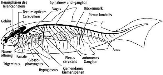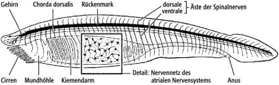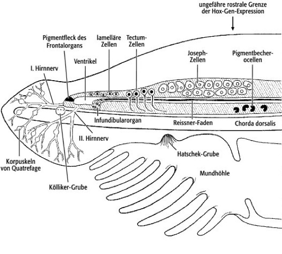 Lanzettfische (Amphioxus;siehe Abb. 2 ): Die nur wenige Zentimeter langen, meeresbewohnenden Lanzettfische besitzen zeitlebens eine Chorda dorsalis, die vom Schwanzende bis in die vordere Körperspitze reicht. Über der Chorda liegt ein gut entwickeltes Rückenmark, das über segmental angeordnete sensorische Nerven (Sinnesnerven) mit der Körperperipherie kommuniziert. Die sensorischen Nerven bestehen – anders als bei den Wirbeltieren – aus Ausläufern von Nervenzellen, deren Perikaryen im Innern des Rückenmarks liegen. Sie teilen sich in einen kurzen dorsalen Ast zum Rücken der Tiere und in längere ventrale Äste, die die Körperseitenwand innervieren. Die motorischen Nerven bestehen – ebenfalls anders als bei übrigen Chordaten – aus Ausläufern der Muskelzellen, die sich ihre Innervation sozusagen vom Rückenmark "abholen". Die Chorda dorsalis der Lanzettfische ist anscheinend aktiv an der Fortbewegung beteiligt: sie wird ebenfalls motorisch vom Rückenmark innerviert. Zusätzlich zu dem vom Rückenmark ausgehenden Anteil des peripheren Nervensystems existiert ein dichtes, von Ganglienzellen durchsetztes Geflecht von Nervengewebe im Bereich des sogenannten Atriums (eine bauchwärts gelegene Kammer, die den Kiemenapparat der Tiere einhüllt). Es wird als atriales Nervensystem bezeichnet. Am Kopfende der Tiere erweitert sich der Zentralkanal des Rückenmarks, und im Neuralrohr treten Zelltypen auf, die sich im Rückenmark nicht finden: dieser vordere Teil des Zentralnervensystems wird als Gehirn bezeichnet ( siehe Abb. 3 ). Tatsächlich ist der Durchmesser dieses Gehirns geringer als der des Rückenmarks, und es liegt – im Gegensatz zu den Gehirnen der übrigen Chordaten – nicht vor dem Vorderende der Chorda dorsalis, sondern darüber. Trotzdem zeigt das Gehirn eine Reihe von morphologischen und molekularen Merkmalen, die einen direkten Vergleich mit dem der übrigen Chordaten zulassen. Die Übergangsregion zwischen Gehirn und Rückenmark wird, wie bei den Schädeltieren, durch die rostrale Expressionsgrenze von Hox-Genen markiert. Der Reissner-Faden wird vom Infundibularorgan am Boden des Gehirnbläschens synthetisiert. An seinem Vorderende trägt das Gehirn ein unpaariges Lichtsinnesorgan (Frontalorgan, ein Homologon der Seitenaugen der Schädeltiere), das mit Zellen am Dach des Gehirns in Verbindung steht, die dem Tectum opticum der Schädeltiere entsprechen. Im Gehirn und rostralen Rückenmark liegen weitere Lichtsinnesorgane in Form einzelner Zellen (Joseph-Zellen, lamelläre Zellen) und in Form von zahlreichen Pigmentbecherocellen (Auge). In den Tentakeln (Cirren), die die Mundöffnung umgeben, liegen Sinneszellen, deren Axone zum Gehirn ziehen. Die Schnauze (das Rostrum) wird von den vordersten zwei, rein sensorischen Hirnnerven innerviert; in ihren Verlauf sind kleine Ganglien eingestreut, die sogenannten Korpuskeln von Quatrefage. Eine Wimpergrube am Dach der Mundhöhle (Hatschek-Grube) wird als Homologon der Hypophyse interpretiert. Eine weitere Wimpergrube an der linken Außenseite des Kopfes (Kölliker-Grube) wurde lange als Riechorgan und Homologon der Nase der Schädeltiere angesehen, was aber wohl nicht zutrifft, weil es keine Nervenfasern gibt, die diese Grube mit dem Nervensystem verbinden.