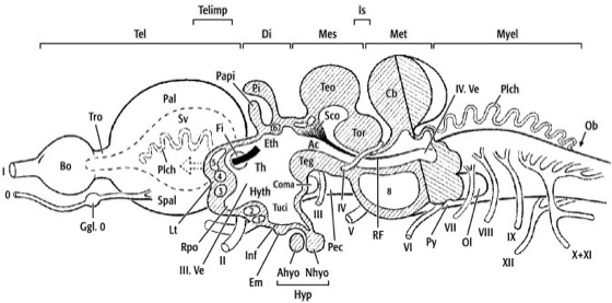 Ac Aquaeductus cerebri (Aquaeductus Sylvii), Ahyp Adenohypophyse, Bo Bulbus olfactorius (Riechkolben), Cb Cerebellum (Kleinhirn), Coma Corpus mamillare (Mamillarkörper), Di Diencephalon, Em Eminentia mediana, Fi Foramen interventriculare, Ggl.0 Ganglion des Nervus terminalis, Hyp Hypophyse, Inf Infundibulum, Is Isthmus, Lt Lamina terminalis, Mes Mesencephalon, Met Metencephalon, Myel Myelencephalon, Nhyp Neurohypophyse, Ob Obex, Ol Oliva inferior (untere Olive), Pal Pallium, Papi Parapinealorgan, Pec Pedunculus cerebri (Hirnstiel), Pi Pinealorgan (Epiphyse), Plch Plexus choroideus (Adergeflecht), Py Pyramide, RF Reissner-Faden, Rpo Recessus praeopticus, Spal Subpallium, Sco Subcommissuralorgan, Sv Seitenventrikel, Teg Tegmentum, Tel Telencephalon, Telimp Telencephalon impar, Teo Tectum opticum (Colliculus superior), Th Thalamus, Tor Torus semicircularis (Colliculus inferior), Tuci Tuber cinereum