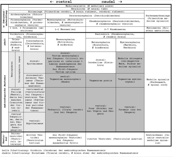 Schädeltiere (Craniota) bzw. Wirbeltiere (Vertebrata); Gehirn ( siehe Abb. 5 ): Die Gehirne der Schädeltiere sind so vielgestaltig wie die Tiergruppen selbst. Die Gesamtmasse des Gehirns variiert von einem tausendstel Gramm (Kraemeria, ein winziger Knochenfisch) bis zu 10 Kilogramm (Physeter, Pottwal), und die Vielfalt der gestaltlichen Ausformungen der Gehirne steht der Größenvariation in nichts nach. An dieser Stelle können deshalb nur die allen Wirbeltieren gemeinsamen Hirnmerkmale kurz abgehandelt werden; wichtige Spezialisierungen einzelner Tiergruppen werden dabei kurz erwähnt. Das Gehirn der Cranioten entsteht stets aus dem vorderen Teil des Neuralrohrs, der sich im Vergleich zum Rückenmark stark erweitert und dessen Wände sich stark verdicken. Alle Schädeltiergehirne durchlaufen ontogenetisch Phasen, in denen das Gehirn zunächst aus zwei (Archencephalon, Deuterencephalon), später aus drei (Prosencephalon, Mesencephalon, Rhombencephalon) und schließlich aus fünf (Telencephalon, Diencephalon, Mesencephalon, Metencephalon, Myelencephalon) blasenartigen Abschnitten besteht ( siehe Tab. ). Jeder dieser größeren Abschnitte wiederum besteht aus morphologisch mehr oder weniger gut voneinander abgrenzbaren Untereinheiten, den Encephalomeren, die je nach dem Hirnabschnitt, zu dem sie gehören, als Prosomeren, Mesomeren oder Rhombomeren bezeichnet werden (Neuromer). Die relative Größe und Differenzierung der einzelnen Abschnitte in den erwachsenen Gehirnen variieren beträchtlich. Primär besitzen alle Schädeltiergehirne kompliziert gestaltete innere Hohlräume (Ventrikelsystem), die sich aus dem Lumen des Neuralrohres ableiten. Diese Räume sind mit Cerebrospinalflüssigkeit gefüllt, die von gefäßreichen Gewebslappen produziert wird (Adergeflecht), welche in oder an diesen Hohlräumen liegen. Nur bei wenigen Schädeltieren (z.B. im Telencephalon und Diencephalon von Schleimaalen) gehen die Ventrikelräume sekundär wieder verloren, so daß dort der Eindruck eines soliden Organs entsteht. – Das Telencephalon (Endhirn) der Schädeltiere besteht stets aus einem vorderen oberen paarigen Teil, den Hemisphären, die die Seitenventrikel enthalten, und aus einem hinteren unteren unpaaren Teil, dem Telencephalon impar. Nur die Hemisphären der Knochenfische weichen von diesem Bauplan ab: Aufgrund einer völlig anders verlaufenden Ontogenese besitzen sie keine inneren Ventrikelräume, bei ihnen werden die Seitenventrikel an die Oberfläche der Hemisphären verlagert. An ihrem rostralen Ende tragen die Hemisphären aller Schädeltiergehirne paarige Riechkolben (Bulbi olfactorii), die die Axone der Riechschleimhaut aus der Nase aufnehmen. Parallel zum Riechnerven (Olfactorius) verläuft ein weiterer Hirnnerv, der Nervus terminalis, der vor allem bei Knorpelfischen sehr ausgeprägt ist, bei vielen anderen Wirbeltieren aber (auch beim Menschen) im Laufe der Ontogenese reduziert wird. Die Axone der Zellen in den Riechkolben ziehen als sogenannte sekundär-olfaktorische Bahnen zu den paarigen Hemisphären des Telencephalon, wo sie mehr oder weniger große Areale bedecken. In den Telencephala aller Schädeltiere gibt es aber Areale, die von Eingängen aus den Bulbi olfactorii frei bleiben, am mächtigsten sind diese nicht-olfaktorischen Areale bei Knorpelfischen, Vögeln und manchen Säugetieren entwickelt. In diese nicht-olfaktorischen Areale des Telencephalon strahlen aufsteigende Fasern aus dem Diencephalon ein, über die verschiedenste sensorische Informationen das Telencephalon erreichen. In vielen Tiergruppen (Knorpelfische, Vögel, Säugetiere) erreicht das Telencephalon eine beträchtliche Größe, bei den Säugetieren ist es der größte Hirnabschnitt. Es sind vor allem die dorsalen Teile des Telencephalon (nämlich die verschiedenen Abschnitte des Pallium), die zu dieser Größenzunahme beitragen. In ihnen entwickelt sich bei Säugetieren der mächtige Cortex, allerdings ist die Entwicklung von Cortices kein auf die Säugetiere beschränktes Phänomen: Schleimaale, Reptilien und Vögel besitzen ebenfalls Cortices in ihren Pallien. Der hintere, unpaare Bereich des Telencephalon, das Telencephalon impar, bildet die Übergangsregion zum Diencephalon. In ihm findet sich eine Gewebeplatte (als Lamina terminalis bezeichnet), die den dritten Ventrikel nach vorne abschließt. In der Lamina terminalis liegen die Commissura anterior und die Commissura pallii; letztere ist bei Säugetieren zum mächtigen Balken entwickelt, der die Cortices der Hemisphären verbindet. – Im Bereich des Telencephalon impar kommuniziert der dritte Ventrikel des Diencephalons (Zwischenhirn) über die Foramina interventricularia (Foramen Monroi) mit den Seitenventrikeln des Telencephalons. Der mittlere Abschnitt der Wand des Zwischenhirns wird als Thalamus bezeichnet. Er steht über zahlreiche Faserbahnen in enger Verbindung mit dem Endhirn. Über und unter dem Thalamus liegen der Epithalamus bzw. der Hypothalamus. Der Hypothalamus steht in enger funktioneller und räumlicher Beziehung zum visuellen und zum limbischen System, zum endokrinen System (Hypophyse) und zum autonomen Nervensystem. Er trägt an seinem Boden die Kreuzung (Chiasma opticum) der optischen Nerven, die, ebenso wie der gesamte nervöse Apparat der Seitenaugen, im Laufe der Ontogenese als paarige Ausstülpungen aus dem Zwischenhirn hervorgingen. Die Hypophyse, eine übergeordnete endokrine Drüse, liegt hinter dem Chiasma opticum. Auf dem Dach des Zwischenhirns, im Epithalamus, liegen die Parietalorgane (Epiphyse und Parapinealorgan), sie können photorezeptiv sein ("drittes Auge") und fehlen nur bei wenigen Tiergruppen. Der Epithalamus enthält darüber hinaus ein olfaktorisches Kerngebiet, das als Habenula (Zügelhalter) bezeichnet wird. – An das Zwischenhirn schließt sich nach caudal das Mesencephalon (Mittelhirn) an. Sein Dach empfängt im vorderen Abschnitt die Fasern des Opticus, es wird deshalb auch als Tectum opticum bezeichne