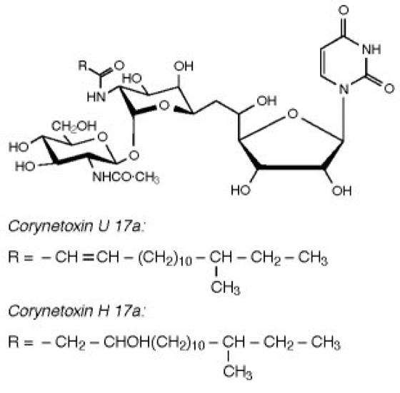Corynetoxine [von griech. koryne = Keule, Kolben, toxikon = (Pfeil-)Gift], Nucleoside aus Uracil, N-Acetylglucosamin und dem C11-Aminozucker Tunicamin, an den Fettsäuren gebunden sind ( siehe Abb. ). Corynetoxine werden von Corynebacterium rathayi gebildet, das Fadenwürmer befällt. Sie werden vor allem von Weidetieren aufgenommen und bewirken eine Hemmung der Biosynthese von Glykoproteinen, woraus sich vielfältige Folgeerscheinungen ergeben. Hierzu gehören neurologische Störungen, die auf einer Schädigung kleiner Blutgefäße, besonders im Kleinhirn, beruhen. Vergiftungssymptome sind: Taumeln, Koordinationsstörungen, Versteifung der Gliedmaßen, Krämpfe, Kollaps und, bei einem Teil der Fälle, auch der Tod.