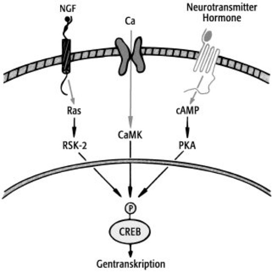 CREB, Abk. für E cAMP/calcium response element binding protein, ein konstitutiv exprimierter Transkriptionsfaktor, der an sogenannte CRE-Sequenzen (cAMP/calcium response elements) in Promotoren von Genen, deren Expression durch cAMP beeinflußt wird (z.B. c-Fos), bindet. CREB wird mittels Phosphorylierung durch Proteinkinase A oder CaM-Kinase (Calcium-Calmodulin-Kinase II) aktiviert und ist ein Mediator in der Signal-Transkriptions-Kopplung von Wachstumsfaktoren oder von Aktionspotentialen ( siehe Abb. ). Aktivierung von CREB ist ein zentraler Schritt in der durch de-novo-Proteinsynthese vermittelten Informationsspeicherung der Gedächtnisbildung.