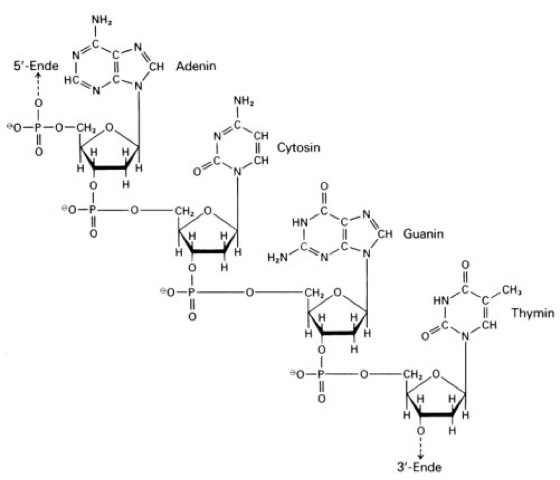 Desoxyribonucleinsäuren, Abk. DNS, Edeoxyribonucleic acids (Abk. DNA), Nucleinsäuren, in denen als monomere Bausteine fast ausschließlich 2'-Desoxyadenosin-5'-monophosphat (dAMP), 2'-Desoxycytidin-5'monophosphat (dCMP), 2'-Desoxyguanosin-5'-monophosphat (dGMP) und 2'-Desoxythymidin-5'-monophosphat (dTMP) vorkommen. Durch Veresterung der 5'-Phosphatgruppe jedes Grundbausteins mit der 3'-Hydroxylgruppe des benachbarten Monomeren bilden sich die unverzweigten DNA-Kettenmoleküle ( siehe Abb. 1 ; siehe Zusatzinfo ). Aufgrund der linearen Verknüpfung der 4 Grundbausteine in nichtzufallsmäßiger und daher schriftartiger Reihenfolge ist DNA Träger der genetischen Information. Diese wird über Kopien in Form von Ribonucleinsäuren (Transkription) in Proteine (Translation) umgesetzt. – Unter physiologischen Bedingungen liegt DNA nicht in der Säureform, sondern als Poly-Anion mit je einer negativen Ladung pro Nucleotidrest vor. Mit Ausnahme der DNAs bestimmter Bakteriophagen besteht DNA aus zwei komplementären Ketten, die über Basenpaarungen zu einer Doppelhelix-Struktur vereinigt sind ( siehe Abb. 2 ). Neben der klassischen, rechtsdrehenden DNA-Doppelhelix (B-DNA) wurden weitere Doppelhelix-Formen entdeckt, so die rechtsdrehende A-DNA und auch eine linksdrehende Form (sogenannte Z-DNA). Durch weitere, den Windungen der DNA-Doppelhelix überlagerte Spiralisierung entstehen sogenannte supercoil-Formen. Diese sind sowohl durch das die DNA umgebende Kationenmilieu als auch durch Bindung von DNA an bestimmte Proteine, bei kernhaltigen Zellen besonders an die Histone, bedingt und führen so zu den stärker verdichteten Strukturen der Chromatiden und Chromosomen, die nach Anfärbung bereits im Lichtmikroskop erkennbar sind. Die Hauptmenge von DNA ist in Eukaryoten in den Chromosomen der Zellkerne lokalisiert. Darüber hinaus kommt DNA extrachromosomal in Mitochondrien (Chondrom) vor und bildet hier die Grundlage für den semiautonomen Charakter dieser Organelle bzw. für extrachromosomale, d.h. nicht den Mendelschen Regeln gehorchende Erbgänge bestimmter Merkmale.