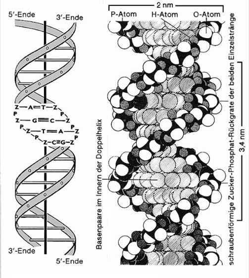 Links schematisch ein Ausschnitt von 19 Basenpaaren (= fast 2 Windungen), rechts als Molekülmodell geringfügig vergrößert und daher als etwas kleinerer Ausschnitt von nur 16 Basenpaaren. Man beachte die beiden verschieden großen, parallel zu den beiden Zucker-Phosphat-Rückgraten verlaufenden Furchen, die als große bzw. kleine Furchen bezeichnet werden; durch diese sind die Basen trotz ihrer Verpackung im Inneren der Doppelhelix und trotz der wechselseitigen Paarung in erheblichen Maße von außen zugänglich. Dies ist von großer Bedeutung für die Interaktion von regulatorisch wirksamen Proteinen (unter anderem Repressoren, Aktivatoren, RNA-Polymerase), da so das "Abtasten" bzw. "Erkennen" spezifischer Nucleotidsequenzen auch ohne Aufbrechen der Doppelhelix möglich ist. Die Dicke der Doppelhelix, entsprechend der größten Breite des rechten Modells, beträgt 1,9 nm; die Länge einer helikalen Windung, die ziemlich genau 10 Basenpaaren entspricht, beträgt 3,4 nm. Die gesamte DNA einer einzigen menschlichen Eizelle bzw. Samenzelle mit etwa 3·109 Basenpaaren summiert sich zu einer Länge von etwa 1 m.