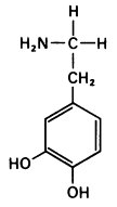 Dopamins,Hydroxytyramin, 3,4-Dihydroxy-β-phenylethylamin, Abk. DA, Edopamine, ein Neurotransmitter des Zentralnervensystems, der als ein biogenes Amin in catecholaminergen bzw. dopaminergen Nervenzellen (Zellgruppen A8-A15) aus Tyrosin entsteht ( siehe Abb. 1 ). Dabei wird zunächst durch die Tyrosinhydroxylase 3,4-Dihydroxyphenylalanin (Dopa) als Zwischenprodukt gebildet. Seine Umwandlung zu Dopamin wird durch die Dopa-Decarboxylasekatalysiert. Das im Cytoplasma entstehende Dopamin wird dann in synaptischen Vesikeln gespeichert. Dopamin bildet zusammen mit Adrenalin und Noradrenalin die Gruppe der Catecholamine. Es ist unmittelbare Vorstufe von Noradrenalin und Adrenalin sowie der Melanine. Dopamin stellt mengenmäßig 80% aller Catecholamine im Gehirn, jedoch ist die Zahl der dopaminergen Nervenzellen mit 1 Million relativ gering. Der Abbau von Dopamin in den dopaminergen Nervenzellen führt meist über Desaminierung und anschließende Oxidation zu Dihydroxyphenylessigsäure und Homovanillinsäure, die beide im Urin nachweisbar sind ( siehe Abb. 2 ). – Seine weitreichenden psychotropen, motorischen, Hormon-modulierenden Wirkungen im Zentralnervensystem und im vegetativen Nervensystem (Dopamin scheint auch in einigen peripheren postganglionären sympathischen Neuronen Transmitterfunktion zu besitzen) entfaltet Dopamin über Stimulation von prä- und postsynaptischen Dopaminrezeptoren der Typen D1-D5. Bei der Depolarisierung der Zellmembran einer dopaminergen Nervenzelle erfolgt eine Calcium-abhängige Freisetzung des Dopamins in den synaptischen Spalt, wo es durch Diffusion die Rezeptoren erreicht und mit ihnen in Wechselwirkung tritt. Das Dopamin-Signal wird durch Wiederaufnahme des Dopamins in das präsynaptische Neuron und Wiederauffüllung der synaptischen Vesikel oder durch Desaminierung des Moleküls durch Monoamin-Oxidase zeitlich begrenzt. Aktivierung von präsynaptischen Rezeptoren (Autorezeptoren) reduziert die pro Impuls freigesetzte Menge an Dopamin und die Dopamin-Synthese. In einem Teil der dopaminergen Neurone ist die Koexistenz von anderen Mediatoren, besonders von Neuropeptiden (z.B. Cholecystokinin, Neurotensin), nachgewiesen worden, mit denen zusammen es auch freigesetzt wird (Cotransmission). Dopaminerge Neuronen kommen im Gehirn in vier Systemen vor: dem nigrostriatalen (mesostriatalen), dem mesolimbischen, dem mesocorticalen sowie dem tuberoinfundibularen System (dopaminerge Systeme). – Dopamin ist an folgenden Funktionen maßgeblich beteiligt: 1) Steuerung der extrapyramidalen Motorik in der Substantia nigra (nigrostriatales System). Die Degeneration dieses Areals bei der Parkinson-Krankheit führt zu einem Dopaminmangel und bedingt ein Überwiegen cholinerger Reaktionen. Hieraus resultiert vermutlich eine verminderte Erregung des Motorcortex durch den Thalamus, was zu den motorischen Störungen bei dieser Krankheit führt. Durch die Gabe von L-Dopa, der Vorstufe von Dopamin, welche die Blut-Hirn-Schranke passieren kann (eventuell in Kombination mit Dopa-Decarboxylase-Hemmstoffen), versucht man, den Dopaminmangel auszugleichen. 2) Beteiligung am Suchtverhalten (Sucht). Die dopaminerge mesolimbische Bahn ist wahrscheinlich die entscheidende anatomische Struktur für die Auslösung von Suchtverhalten (z.B. durch Amphetamine, Cocain, Ethanol, Nicotin, Opiaten sowie bei durch Streß verstärktem Suchtverhalten). Chronischer Opiatmißbrauch verändert die Signaltransduktion im mesolimbischen dopaminergen System. Es kommt im Nucleus accumbens zur Erhöhung des extrazellulären Dopamins, das vor allem für die initiale Konditionierung und Sensibilisierung der Sucht verantwortlich ist. Während der Entzugsphase sind im Nucleus accumbens die Dopaminkonzentrationen vermindert. Die suchtauslösende Wirkung von Dopamin wird über D1- und D2-Rezeptorgruppen vermittelt. Die genaue Rolle beim sogenannten Belohnungsverhalten (Belohnung) ist noch unklar. Daneben ist Dopamin im Thalamus an der Auslösung des craving beteiligt. 3) Dopamin ist als Gonotropin-releasing inhibitor Haupthemmer der Prolactin-Freisetzung im Hypothalamus. 4) Im peripheren Nervensystem fördert Dopamin die Durchblutung der Niere und moduliert die Darmaktivität. 5) Veränderungen des dopaminergen Systems spielen eine Rolle bei verschiedenen psychotischen Erkrankungen. Überfunktion der Dopamintransmission im mesolimbischen System wird als ein pathogenetischer Faktor der Schizophrenie diskutiert, da Neuroleptika ihre Wirkung als Antagonisten von Dopaminrezeptoren entfalten. Mangel an Dopamin trägt zur Ausbildung der endogenen Depression bei; eine Verstärkung der Dopaminaktivität durch Hemmung des Dopamintransports findet bei der Therapie der Depression Anwendung. Dopamin wird darüber hinaus zur Schocktherapie eingesetzt, um einerseits eine Verengung der Gefäße im Bereich der Haut und Muskulatur, andererseits eine Erhöhung der lebenswichtigen Nierendurchblutung zu erreichen; außerdem erhöht es die Kontraktionskraft des Herzens.