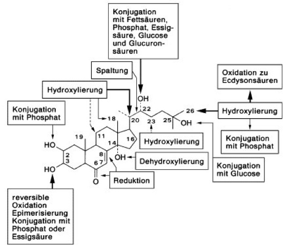 Modifikationen des Ecdyson-Moleküls im Verlauf des Metabolismus (dicke Pfeile: weitverbreitete Reaktion; dünne Pfeile: nur in wenigen Arten gefundene Reaktion; gestrichelte Pfeile: vermutete, noch nicht direkt nachgewiesene Reaktion).