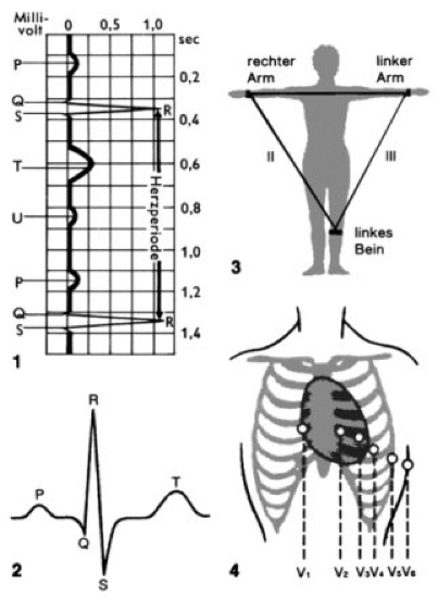 1 normales Elektrokardiogramm, 2 Herzstromkurve, 3 Extremitätenableitungen ("Einthoven-Dreieck"), 4 Brustwandableitungen.
