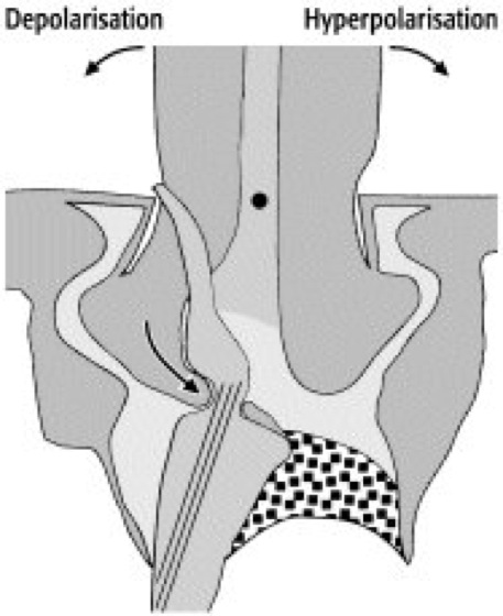 Fadenhaar-Sensillum s, Sensillum trichodeum, Etrichoid sensillum, epidermales Sinnesorgan bei Gliederfüßern (Arthropoden), das aus einem Haar und wenigen Sinneszellen besteht. Es dient der Wahrnehmung sehr kleiner Kräfte, wie z.B. Luftströmungen. Im Unterschied zum Borstensensillum ist die Empfindlichkeit richtungsselektiv, da entgegengesetzte Haarauslenkungen entweder zur Depolarisation oder Hyperpolarisation der Sinneszellen führen ( siehe Abb. ).
