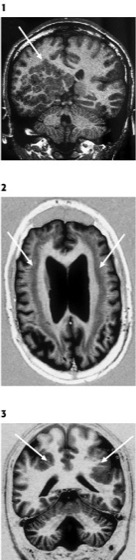 Als Polymikrogyrien wird das Vorliegen von abnormen, in ihrer Anzahl vermehrten und in ihrer Größe verminderten, unvollständig bzw. nur durch flache Sulci voneinander getrennten Windungen bezeichnet ( siehe Abb. 3 ). Die Gehirnoberfläche weist im Bereich der Polymikrogyrien ein blumenkohlartiges Aussehen auf. Der Cortex ist abnorm verbreitert, jedoch nicht so dick wie bei Pachygyrien. Polymikrogyrien können eng umschrieben oder weit ausgedehnt vorkommen. Gehäuft findet man sie einseitig oder beidseitig in der Umgebung der Sylvius-Furche. Bei Polymikrogyrien konnten laminäre Nekrosezonen mit Schwerpunkt in der 5. Rindenschicht bei vorhandener Schichtengliederung des Cortex nachgewiesen werden. Eine Verursachung durch verminderte Durchblutung (Ischämie) nach der 20. Gestationswoche, d.h. eine postmigratorische Störung, wird für die meisten Fälle als ursächlich angenommen. Bei Polymikrogyrien mit fehlender Rindenschichtung ist eine frühere Schädigung zu postulieren. Durch perinatale Durchblutungsstörungen entstandene Schädigungen mit Verkleinerung der Windungen werden Ulegyrien genannt; sie sind von Polymikrogyrien zu unterscheiden und nicht den Fehlbildungen zuzuordnen (da perinatal). Bei der Schizencephalie wird der gleiche Entstehungsmechanismus wie bei den Polymikrogyrien angenommen. Es besteht eine mehr oder weniger breite liquorgefüllte Lücke, die vom Ventrikel bis zur Gehirnoberfläche reicht und bis in die Tiefe von einem Band grauer Substanz gesäumt ist. Übergänge von reinen Polymikrogyrien bis zur vollständigen Schizencephalie (Polymikrogyrien mit "infolding", "open-" und "closed-lip-"Schizencephalie) werden angenommen. In etwa einem Drittel der Fälle kommen Schizencephalien beidseitig vor. Die häufig auf ausgedehnte Infarkte oder Blutungen zurückgehenden Porencephalien sind später entstehende (encephaloklastische) Läsionen und weisen im Gegensatz zu Schizencephalien keine randständige graue Substanz auf.