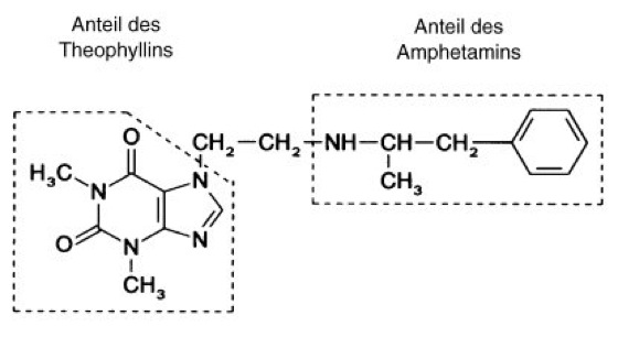 Fenetyllins,Efenetylline, Verbindung aus Amphetamin und Theophyllin ( siehe Abb. ), die als Stimulans und Halluzinogen eingesetzt wird. Designerdrogen.