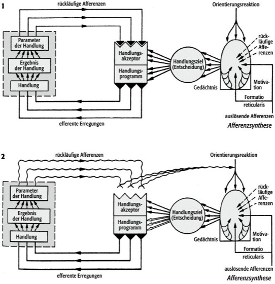 Funktionelles System des Verhaltensaktes nach P.K. Anochin – schematische Darstellung. 1 Die Ergebnisse der Handlung signalisieren über rückläufige Afferenzen dem Handlungsakzeptor, daß das Handlungsziel erreicht wurde; der Handlungsvorgang ist abgeschlossen. 2 Da hier die Rückmeldung nicht mit dem Handlungsprogramm übereinstimmt, wird eine Orientierungsreaktion ausgelöst, die zur Entscheidung für ein neues Handlungsprogramm führt.