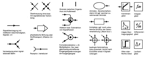 Die wichtigsten graphischen Symbole für verhaltensbiologische Funktionsschaltbilder (nach B. Hassenstein)