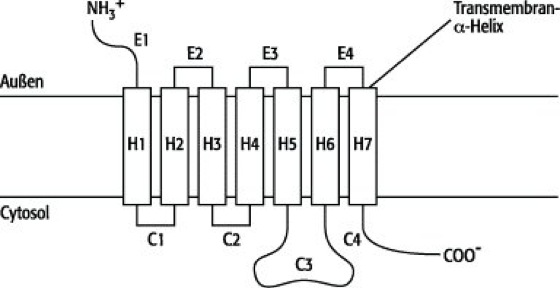 Schematische Darstellung. E1-E4 extrazelluläre Schleifen; H1-H7 Transmembran-Helices; C1-C4 cytosolische Schleifen.