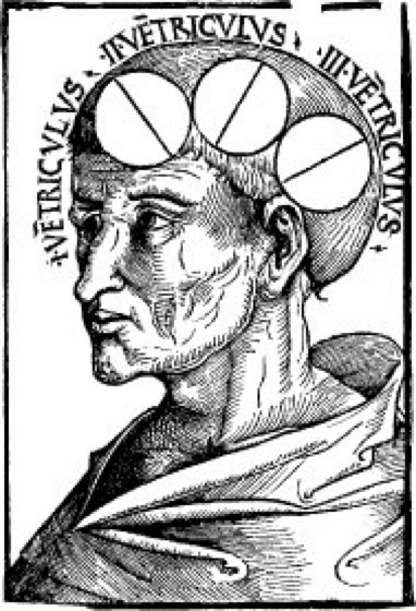 Abb. 2: Illustration aus der Philosophia naturalis von Albertus Magnus in der Ausgabe von 1506, in der drei Ventrikel eingezeichnet sind. Hier sind die drei Hauptventrikel, die der Wahrnehmung, dem Denken und dem Gedächtnis zugeordnet waren, bereits unterteilt. Aus dem Spätmittelalter gibt es Illustrationen mit mehr als 10 verschiedenen 'Fakultäten' im Kopf.