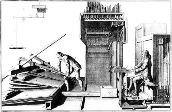 Abb. 4: Die Orgel als Modell für die Funktionsweise des Gehirns. In dieser Darstellung des Aufbaus einer Orgel aus dem Jahre 1776 ist links der Windkasten zu sehen, in dem Luft in Bewegung gesetzt wird. In der Mitte steht die Traktur, in welcher der Luftstrom über Ventile von den Tasten und Registern her gesteuert wird. Rechts befindet sich das Manual, an dem der Organist sitzt, hinter dem das Pfeifenwerk erkennbar ist, welches die Musik wahrnehmbar werden läßt. In Descartes¦ Vorstellung entspricht der Windkasten dem Herzen und den Arterien, die Luft dem Spiritus animalis, die Traktur dem Ventrikelsystem mit seinen zahlreichen Poren, der Organist dem Willen und die Musik dem Verhalten des ganzen Organismus.