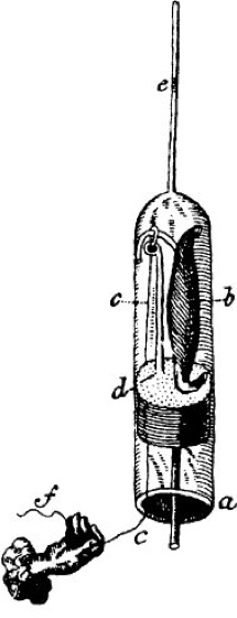Abb. 6: Versuchseinrichtung eines Experiments von Swammerdam (1738). Der Muskel b wird über die Reizung seines Nervs durch Zug am Silberdraht c kontrahiert. Der Silberdraht wird durch die Dichtung d aus dem geschlossenen Gefäß heraus geführt. Der Wassertropfen e im ausgezogenen oberen Ende des Gefäßes blieb bei Bewegung des Muskels unbewegt. Also hat er sein Volumen bei der Kontraktion offenbar nicht verändert, was Descartes¦ Vorstellungen widersprach.