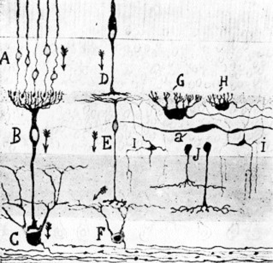 Abb. 7: Nervenzellen in der Netzhaut eines Fisches in einer Zeichnung nach einem Golgi-Präparat von Ramón y Cajal. Mit den Pfeilen gab Ramón y Cajal die Richtung des ausschließlich erregend gedachten Signalflusses innerhalb des Netzwerks von Nervenzellen an, die er aus der Anordnung der verschiedenen Nervenzelltypen erschloß.