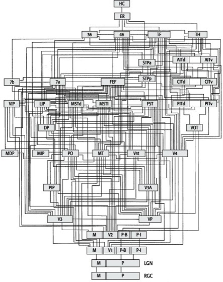 Abb. 8: Schematische Darstellung derjenigen Gebiete der Hirnrinde eines Rhesusaffen, die dem Sehen dienen. Von den retinalen Ganglienzellen (RGC) im Auge ausgehend gelangen die durch visuelle Reize induzierten Nervensignale über das Zwischenhirn (LGN) zunächst in den primären visuellen Cortex V1, um von dort in verschiedene Kanäle geleitet zu werden, die ein komplexes Netzwerk bilden, das über 30 verschiedene Hirnrindengebiete einschließt.