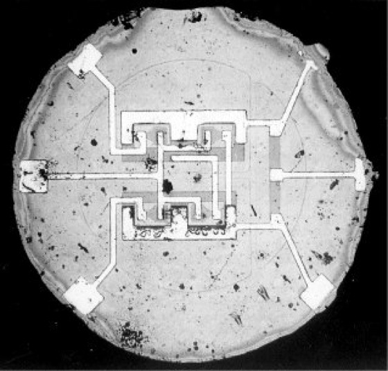 Abb. 10: Ein Halbleiterbaustein von 2 mm Durchmesser. Die vier kegelförmigen Gebilde sind Transistoren, mit deren Hilfe die logischen Operationen in einem Computer ausgeführt werden. Computer, die aus vielen Millionen solcher Bauteile bestehen, avancierten im 20. Jahrhundert zum Modell für die Funktionsweise des Gehirns. So wie in einem Computer hochkomplexe Informationsverarbeitungsprozesse ausgeführt werden können, so soll diesem Modell zufolge das Muster der Kommunikation zwischen den Neuronen des Gehirns unsere komplexen sensorischen, motorischen und kognitiven Leistungen hervorbringen.