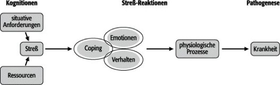 Bei diesem streßtheoretischen Modell wird angenommen (von rechts nach links), daß pathogene physiologische Prozesse sich aus dem Miteinander von Emotionen, Coping und Gesundheitsverhalten ergeben, welches seinerseits vom Ausmaß des psychischen Stresses maßgeblich mitbestimmt wird. Streß schließlich resultiert aus der subjektiven Einschätzung von Anforderungen im Verhältnis zu den eigenen Bewältigungsressourcen.
