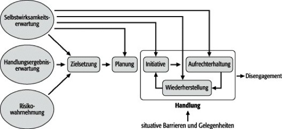 Um die Änderung von schwierigen Verhaltensweisen verstehen und erklären zu können, bedarf es theoretischer Vorstellungen, in denen die Einflußgrößen und Wirkmechanismen abgebildet werden. Dazu hat die Gesundheitspsychologie eine Reihe von Gesundheitsverhaltensmodellen entwickelt ( siehe Abb. 2 ). So wird heute angenommen, daß Menschen zunächst einen konflikthaften Entscheidungs- und Motivierungsprozeß (Motivation) durchlaufen, der in einer Zielsetzung gipfelt, bevor sie darangehen, das neue oder schwierige Verhalten auszuprobieren. In dieser ersten Phase werden sie von Kognitionen geleitet, vor allem von Ergebniserwartungen und Selbstwirksamkeitserwartungen. Wenn sie sich dann ein konkretes Handlungsziel setzen ("Ich will ab übermorgen nicht mehr rauchen"), steigen sie in eine motivational ganz andere Phase ein, in der es zunächst um die Planung und Handlungsinitiative geht und später um die Handlungsausführung, -aufrechterhaltung und -wiederherstellung nach Rückfällen. Auch in dieser Phase erweisen sich personale und soziale Ressourcen als anstoßend und unterstützend. Wer optimistisch an die eigene Kraft zum Durchhalten glaubt oder bei Bedarf sein soziales Netz geschickt zu mobilisieren weiß, vermag sein Leben nachhaltig zu verändern, auch wenn erst Widerstände überwunden werden müssen.